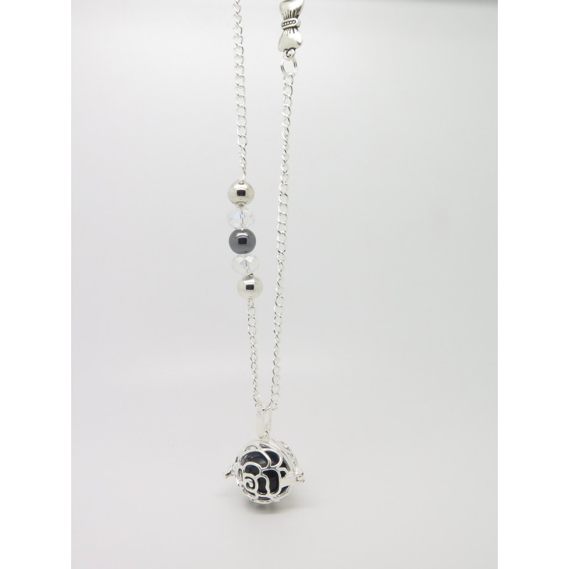 BOLA DE GROSSESSE CUIVRE COULEUR ARGENT, CHAÎNE ORNÉE DE PERLES DE VERRE, HÉMATITE ET N'UD, CADEAU FUTURE MAMAN