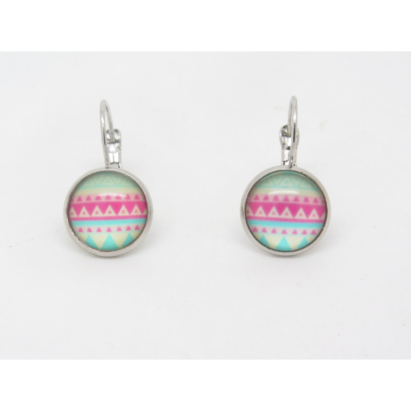 Ce sont des dormeuses en acier inoxydable 316 L avec un cabochon en verre et graphisme, diamètre 1.2 cm.