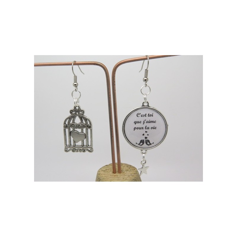BOUCLES D'OREILLES PERSONNALISABLE CLIP OU OREILLE PERCÉE CABOCHON ARGENTÉ THÈME AMOUR ET CAGE AVEC UN COEUR CADEAU ÉPOUSE,