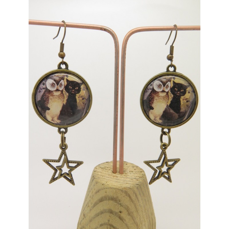 BOUCLES D'OREILLES STYLE RÉTRO ET VINTAGE CABOCHON LE HIBOU ET LE CHAT AVEC UNE ÉTOILE