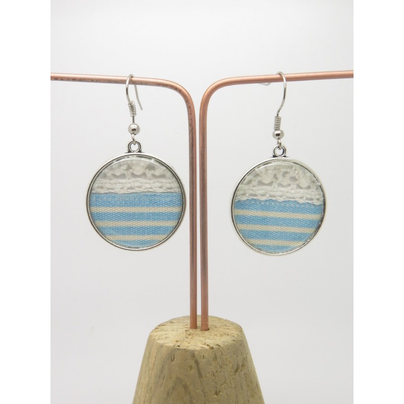 Elles sont constituées d'un cabochon de diamètre 2.5 cm et fait avec le tissu à rayure bleu et la dentelle. Elles sont recouverte d'un cabochon.