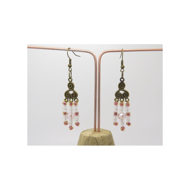 Elles sont constituées d'une estampe en métal couleur bronze et des décentes de perles de verre facetté rose pâle et de perles de rocaille toho blanche et rose.