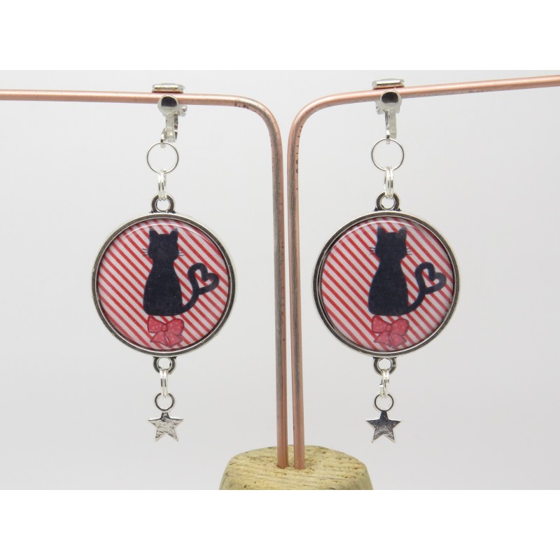 BOUCLES D'OREILLES STYLE VINTAGE AVEC CABOCHON THÈME CHAT OPTION CLIP OU OREILLE PERCÉES